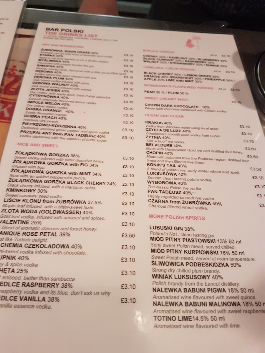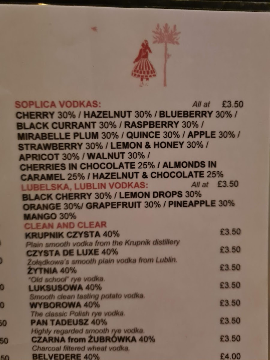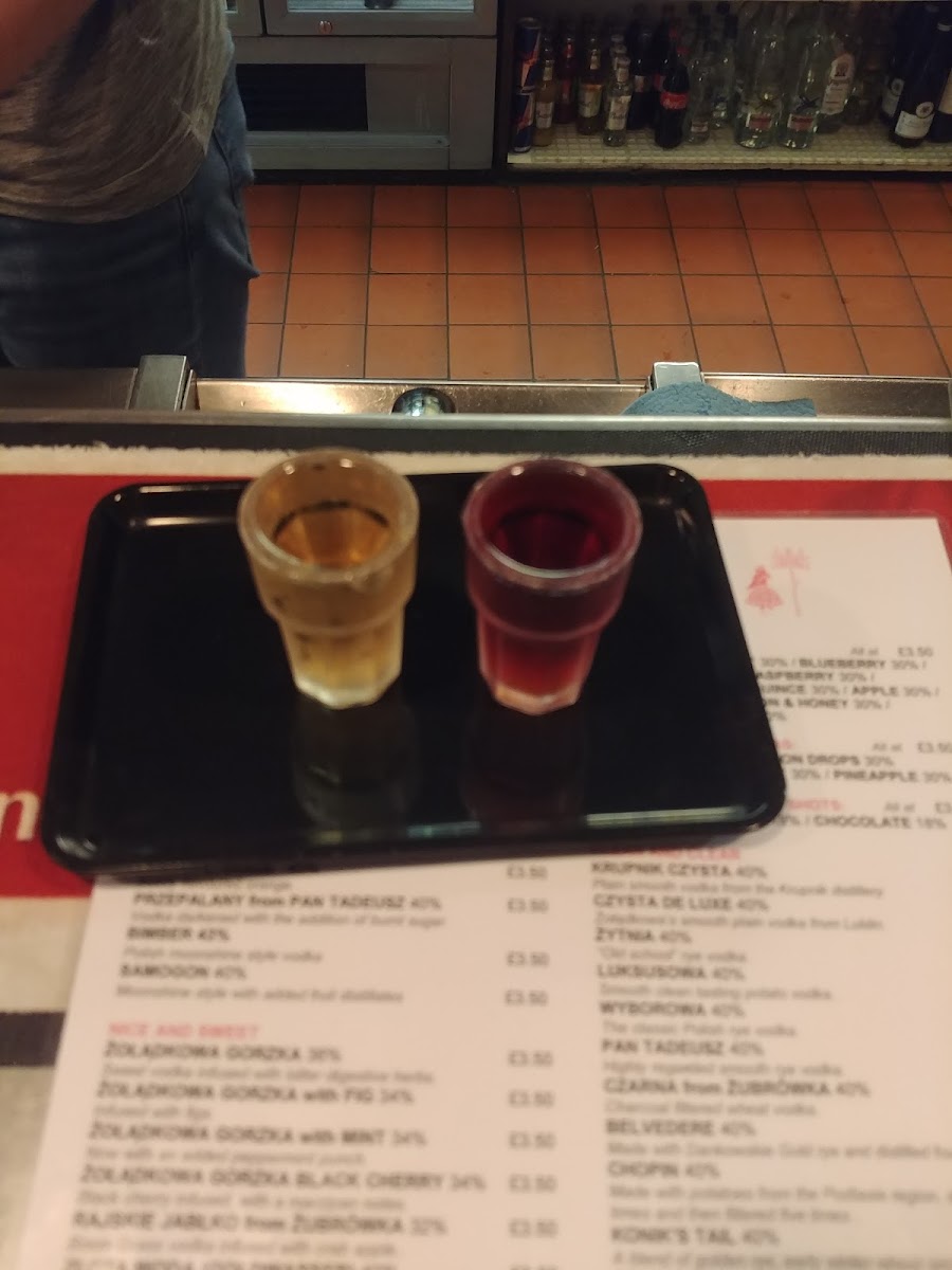 Drinks here focus on authentic Polish vodkas, featuring both clean and infused varieties, alongside other spirits like tequila and a modest range of beers. The selection encourages slow sipping and sampling, fitting the bar’s relaxed pace.